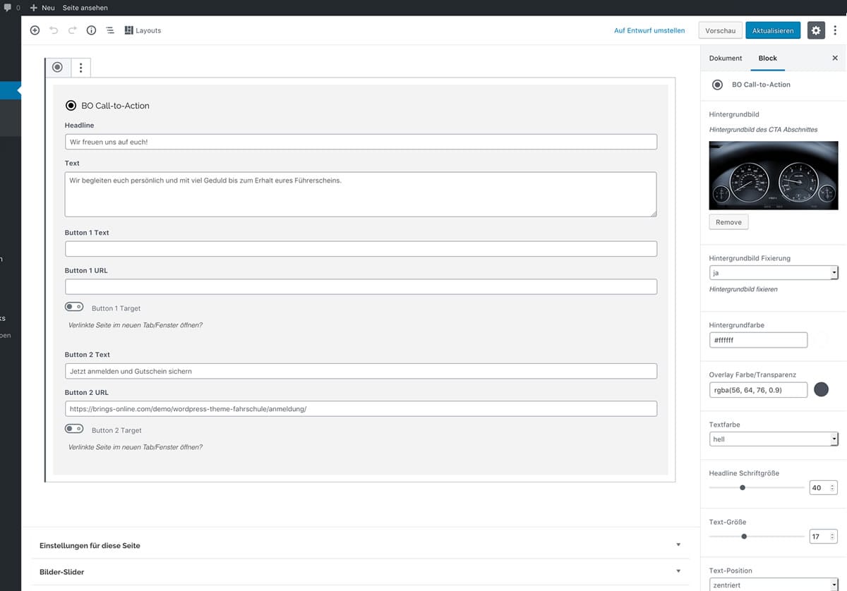 Hier finden Sie einige Screenshots zu den verschiedenen Elementen im WordPress Dashboard. Zum Vergrößern auf ein Bild klicken! Theme-Einstellungen Optionaler Kontaktabschnitt im Footer Individuelle Farbauswahl Beispiel: Iconbox-Block Individuelle Seiteneinstellungen Beispiel: Teambox-Block Blockbearbeitung im Editor Beispiel: CTA-Block